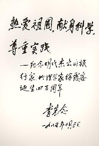 1985年10月15日,国家主席李先念为徐霞客诞生四百周年题词“热爱祖国、献身科学、尊重实践”。